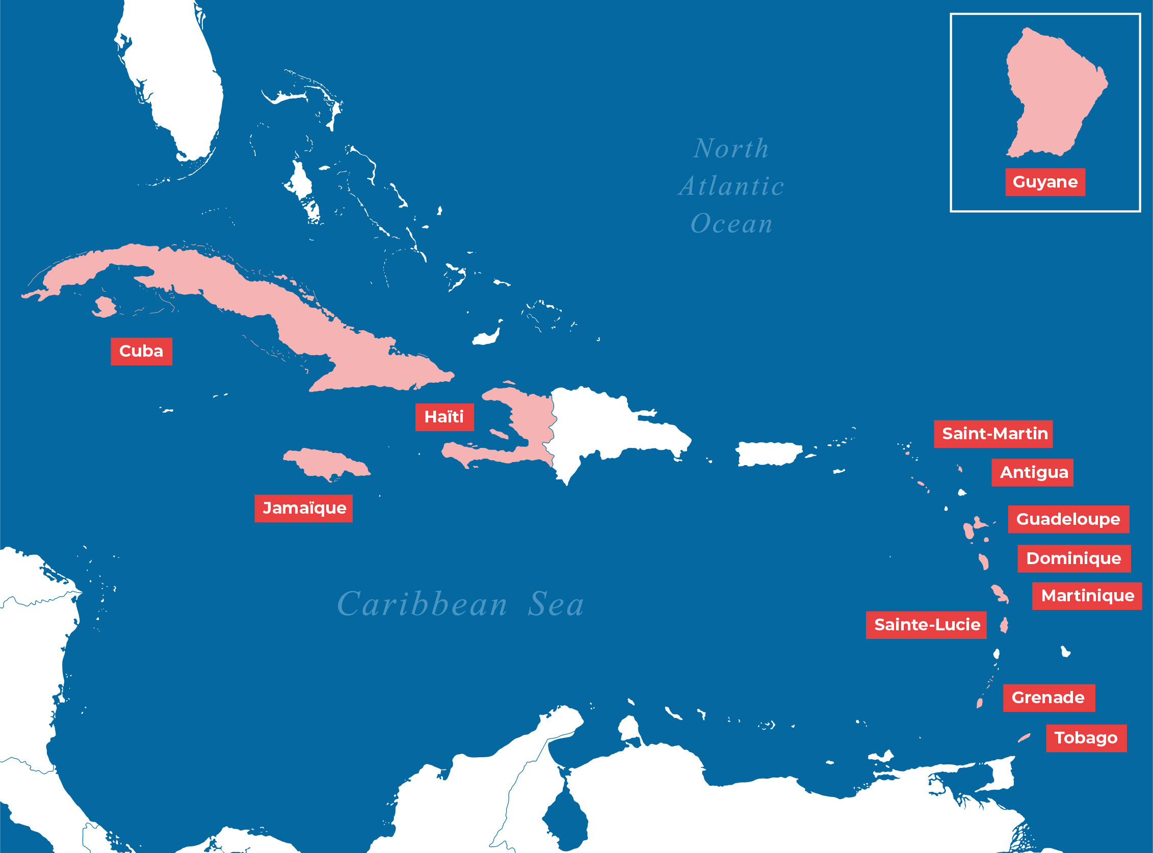 Jamaïque, Cuba, Haïti, Saint-Martin, Antigua, Guadeloupe, Dominique, Martinique, Sainte-Lucie, Grenade, Tobago, Guyane.