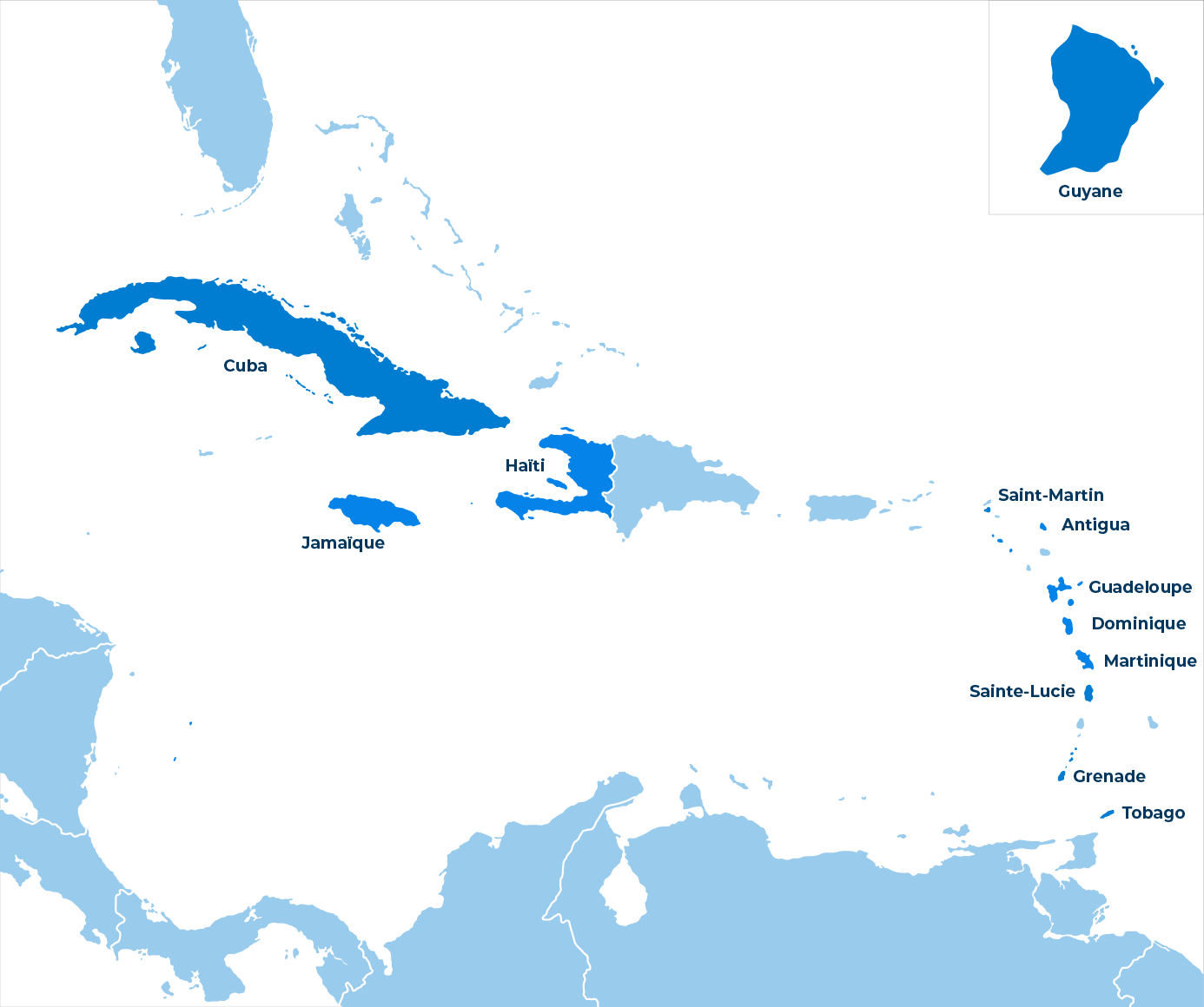 Jamaïque, Cuba, Haïti, Saint-Martin, Antigua, Guadeloupe, Dominique, Martinique, Sainte-Lucie, Grenade, Tobago, Guyane.